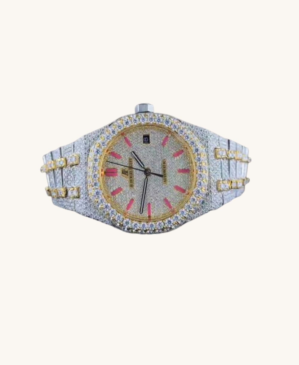 For those who live life without compromise, we present the Maharaja Iced-Out Timepiece. This watch is a spectacular showcase of masterful stone setting, with thousands of brilliant, hand-set moissanite stones covering every millimeter of the iconic octagonal case, dial, and integrated bracelet. The luxurious two-tone design features a warm, gold-tone bezel and bracelet accents that contrast beautifully with the cool, silver-toned body.